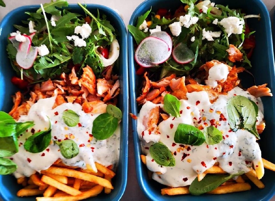 su sultinga vištiena arba kiauliena, šviežiomis daržovėmis, Fetos sūriu, gruzdintomis bulvytėmis ir pasirinktu padažu: graikiško jogurto ir mėtos, Provanso žolelių su česnakais arba aštriu